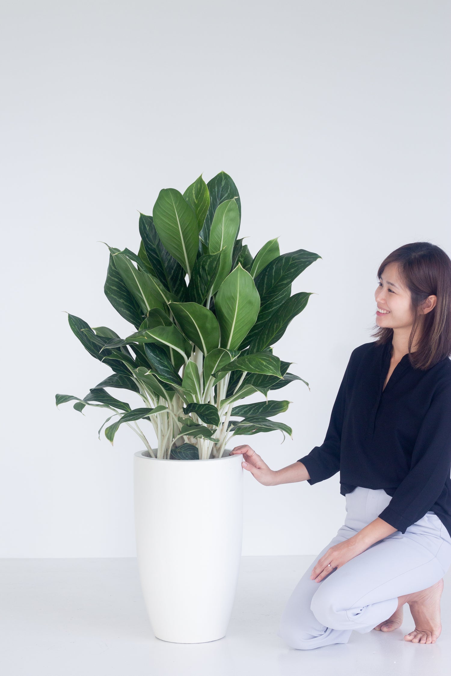 Planted in the modern Olympia fibreglass planter, the sleek and minimalist design enhances the plant's natural beauty while providing a stable and stylish base. This combination makes it an ideal statement piece for both home and office environments.