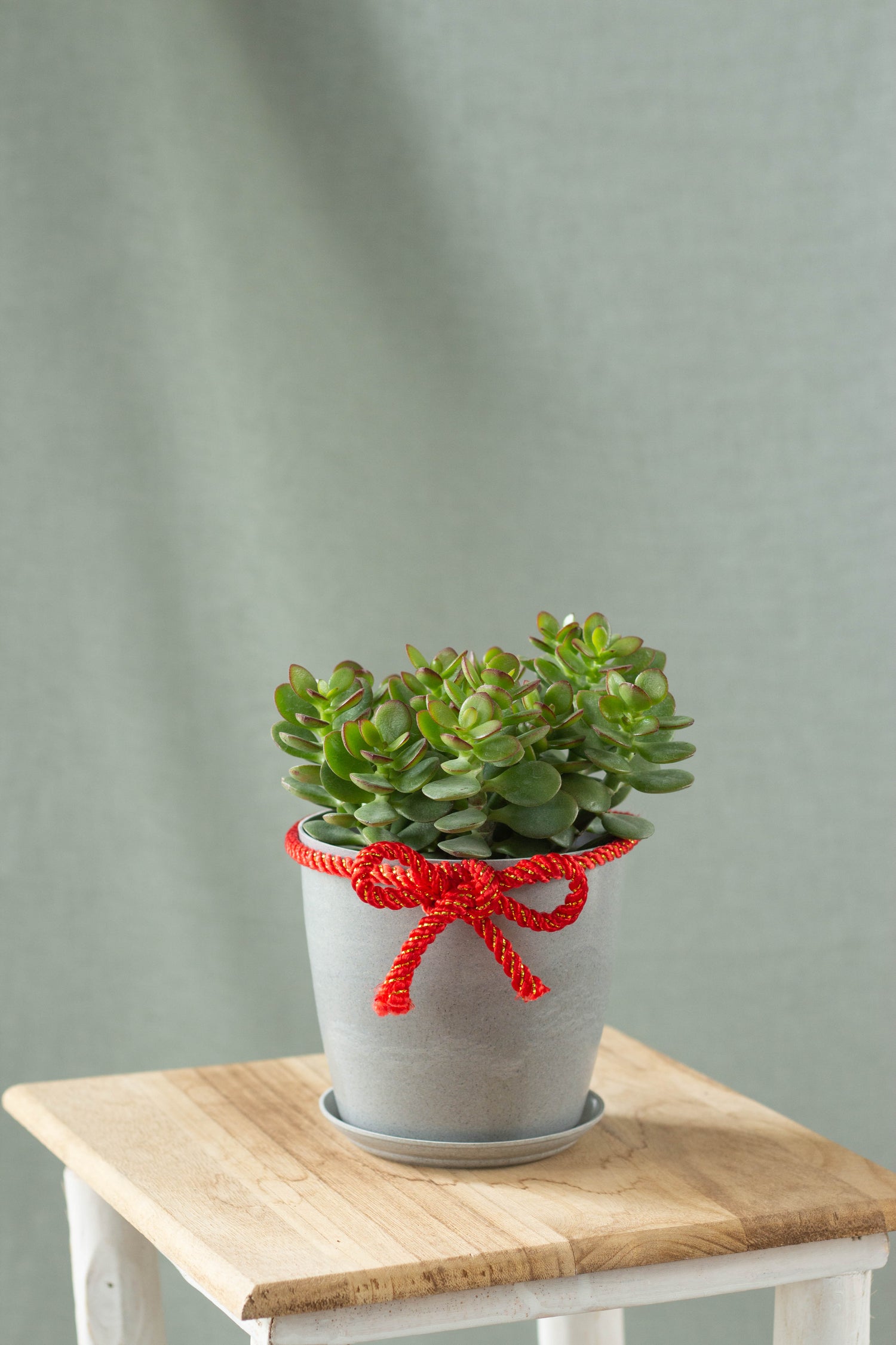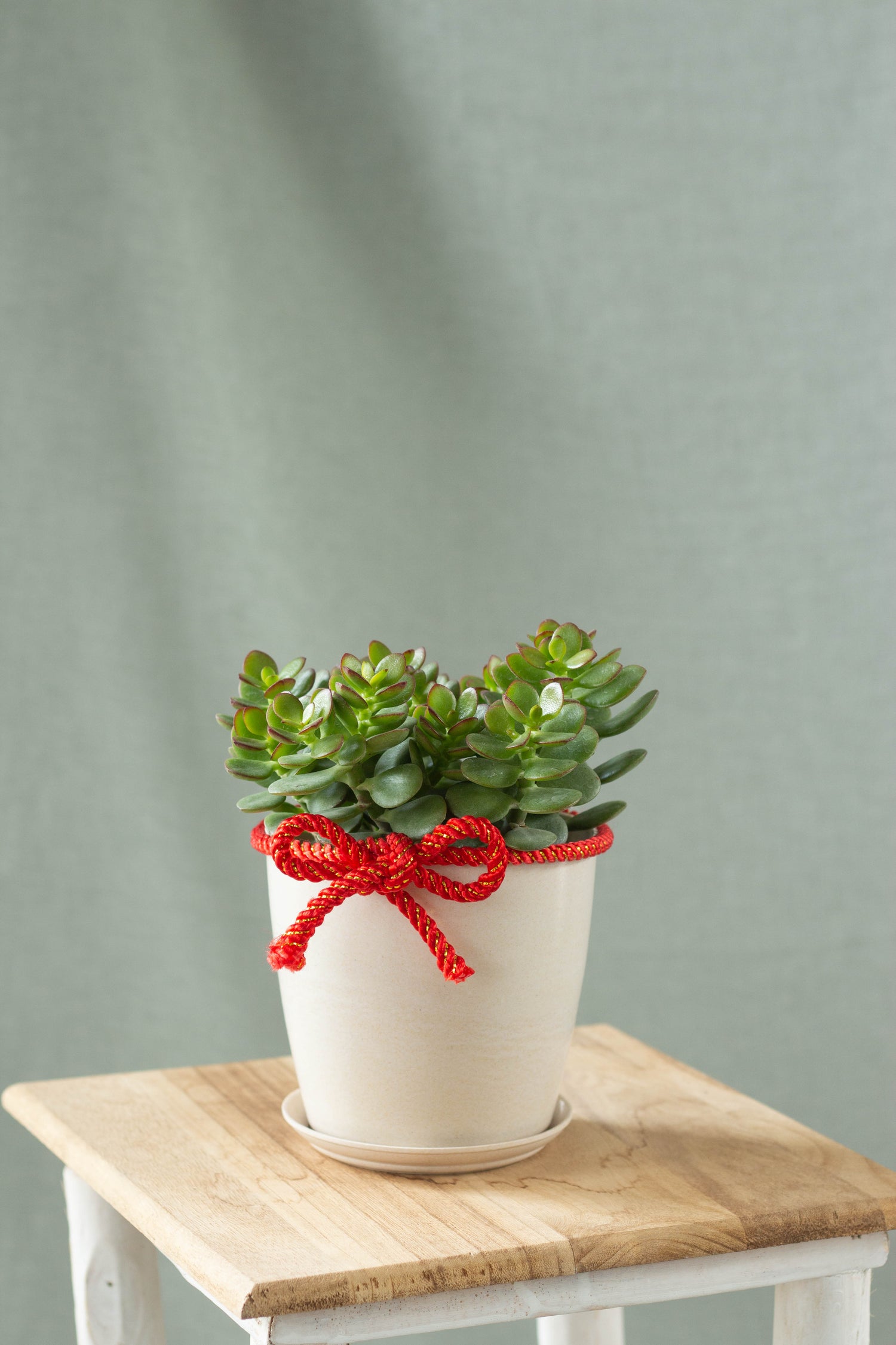 Rounded green fleshy leaves with red lining believed to bring wealth and good fortune, includes ribbon