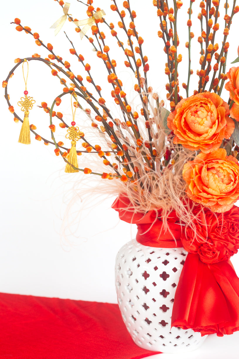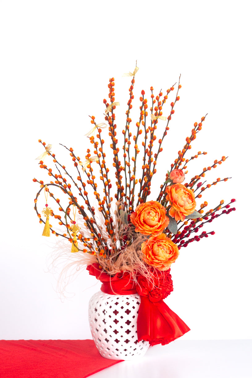 The Signature Luxe Willow is a refined expression of festive abundance, thoughtfully designed to usher prosperity and elegance into modern interiors. Crafted with a harmonious blend of contemporary styling and traditional Lunar New Year elements, this arrangement offers a refreshed interpretation of classic festive décor.